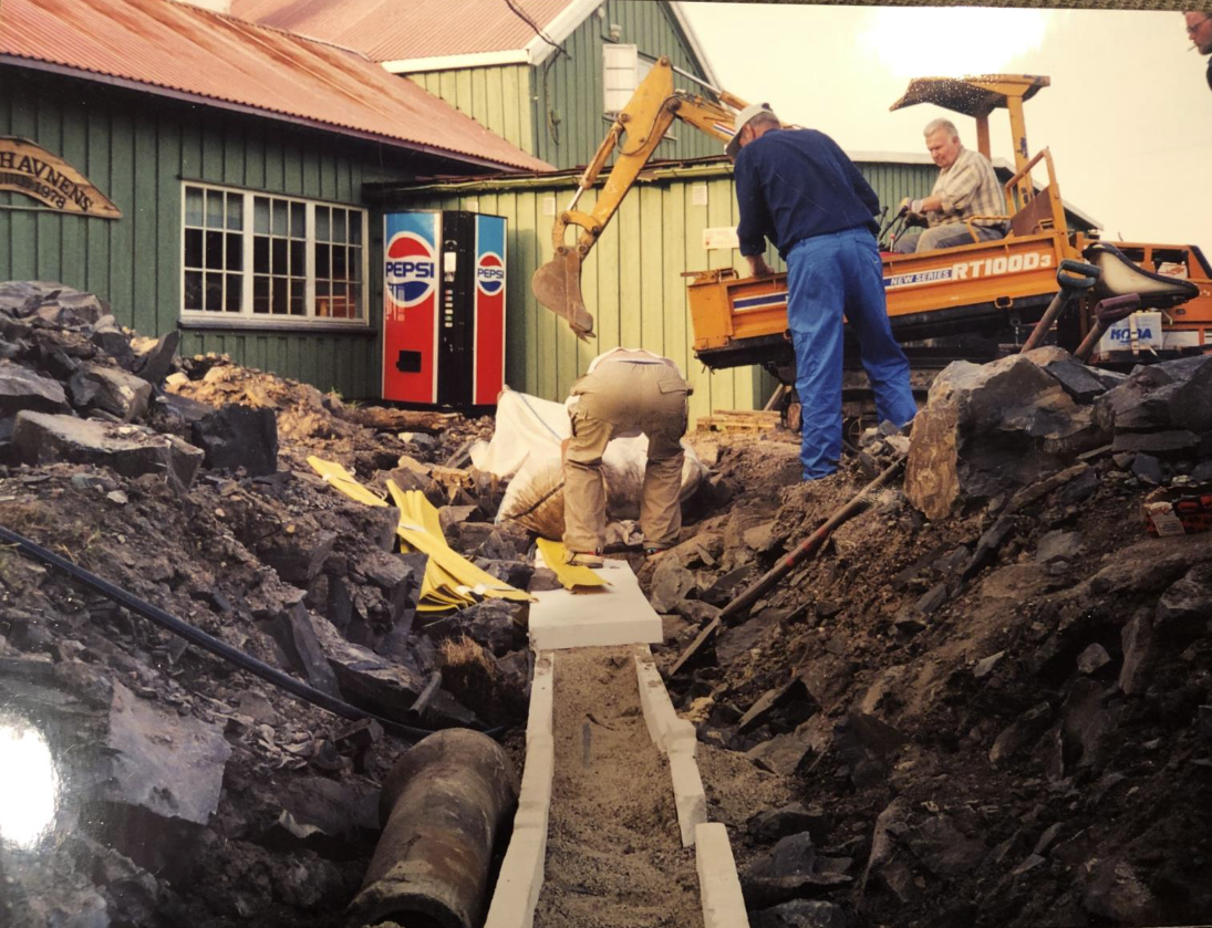 Vi måtte også håndtere avløpet fra restauranten. Jeg laget en fettavskiller i syrefast stål og monterte den på avløpet. Den har fungert i mange år. Vi la også et 50 mm plastrør i bakken sammen med strøm og vann til restauranten.