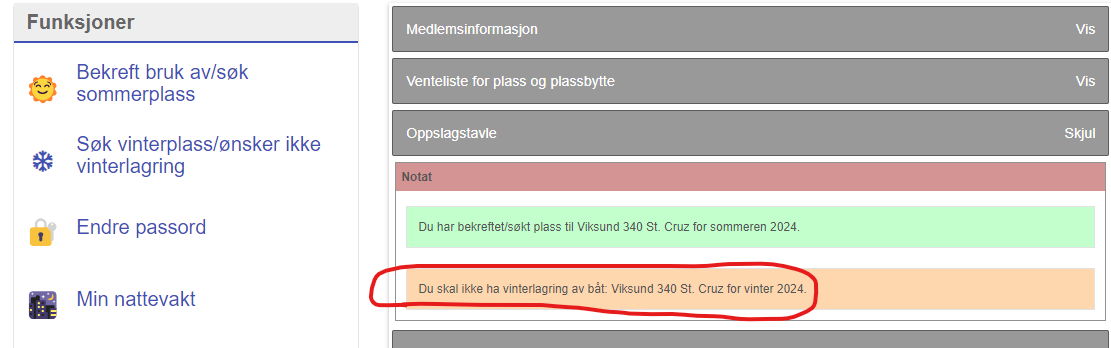 Hvis det står noe annet (eller ingenting) under “Notat” så har du ikke fått registrert vinterplass riktig. Ta kontakt med styret for hjelp.